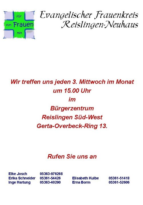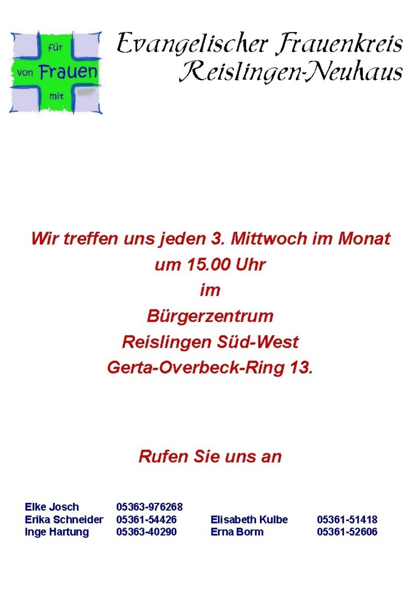 Ev. Frauenkreis Reislingen – Neuhaus immer 15.00 bis 17.00 Uhr